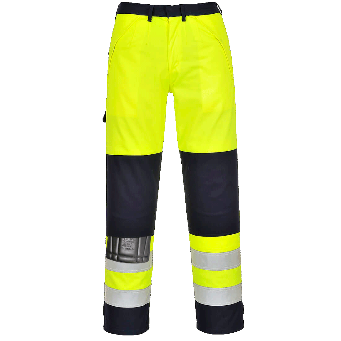 FR62-huomiohousut on valmistettu tultahylkivästä Bizflame Multi-kankaasta. Asu suojaa monilta vaaroilta kuten lämpö, liekki, kemikaalit, valokaari ja hitsauskipinät. Kaksoistikatut heijastinraidat lahkeissa, edessä messinkivetoketjut ja kaksi läpällistä taskua sekä takana yksi läppätasku ja työkalutasku.