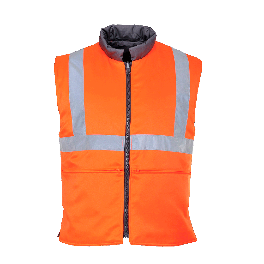 Erinomainen laatu ja joustavuus, lämpöliivi asu on suunniteltu kaksi tilavaa taskua sekä oranssin turvavärin puolelle että kääntöpuolen harmaalle puolelle.