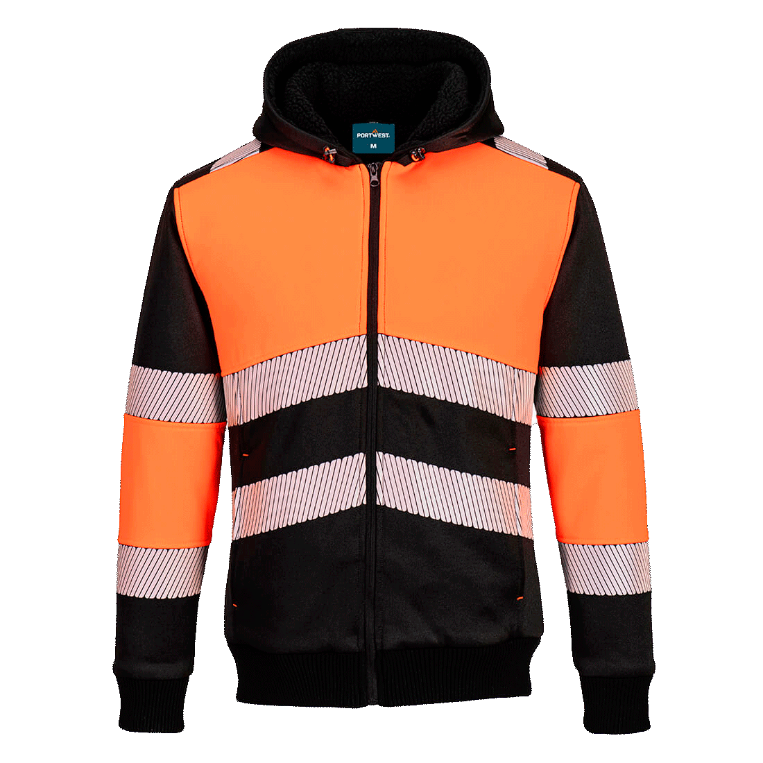 PW3: n Vetoketjullinen talvihuppari, Huomioluokka 1. Erottuva design, joustavat HiVisTex Pro- katkoheijastin teipit ja tummat kontrasti kankaat. Tarjoaa poikkeuksellista mukavuutta ja pitää käyttäjänsä lämpimänä. 2 reilun kokoista vetoketjullista sivutaskua, Hupparin istuvuus on väljä ja kangas on pehmeän tuntuinen