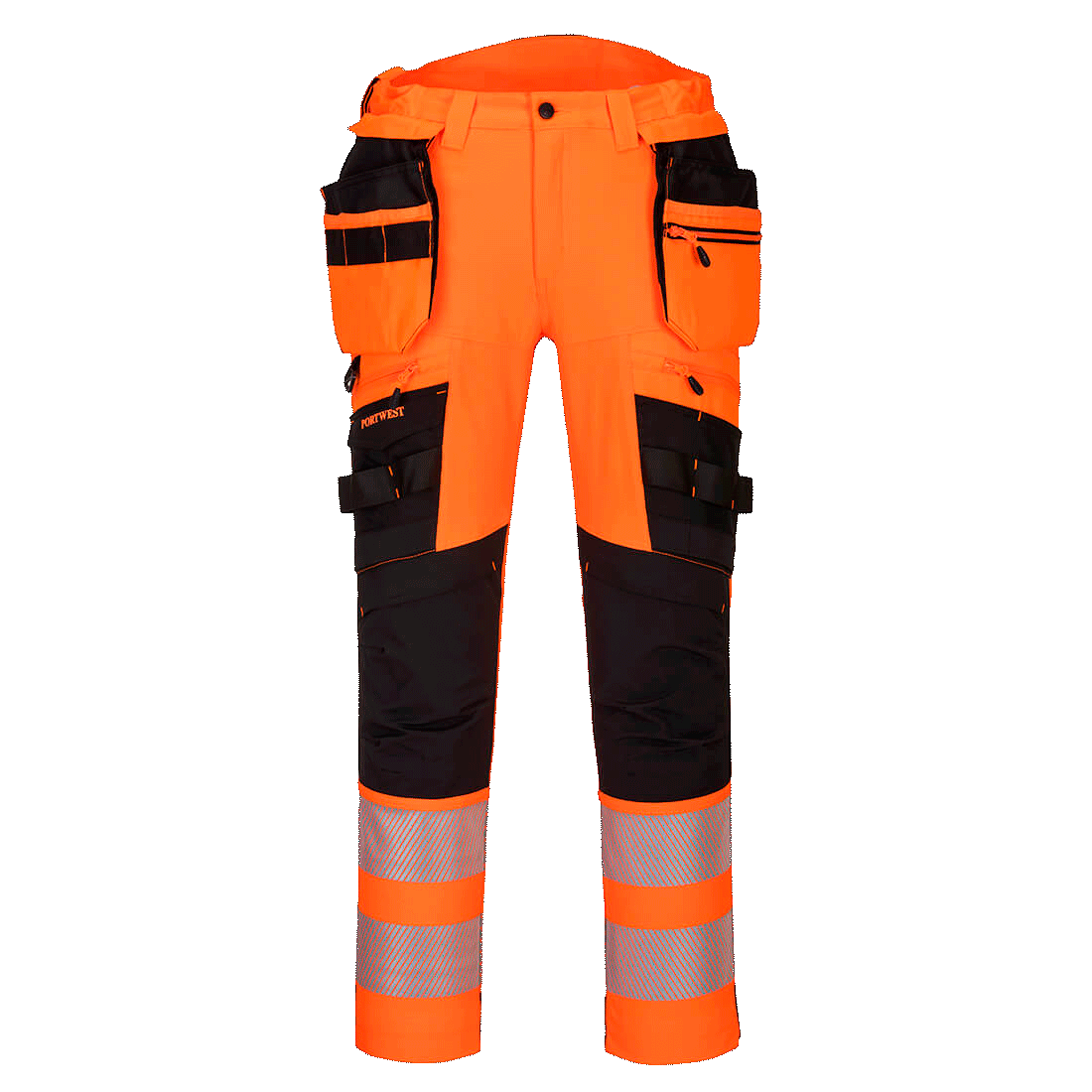 Ergonomisen istuvaksi suunnitellut huomiovärihousut irrotettavilla riipputaskuilla on valmistettu neljään suuntaan joustavasta kankaasta. Housuissa on takaa korotettu vyötärölinja, jossa on joustavat sivut, mikä takaa suojan ja mukavuuden kaikissa työasennoissa. Esitaivutetut ylhäältä täytettävät polvisuojataskut, reilun kokoiset etutaskut ja vetoketjullisia säilytystaskuja. Kolminkertaisesti ommellut saumat lisäävät kestävyyttä
