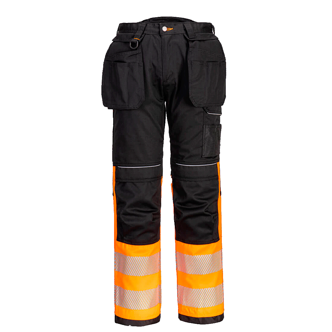 Näkyvyysluokan 1 riipputaskuhuomiohousuissa on ylhäältä täytettävät polvisuojataskut ja käytännöllisiä taskuja puhelimelle, avaimille ja työkaluille. Kulutukselle alttiissa kohdissa on Oxford - vahvikekankaat ja kolminkertainen tikkaus kestävyyttä vaativissa kohdissa