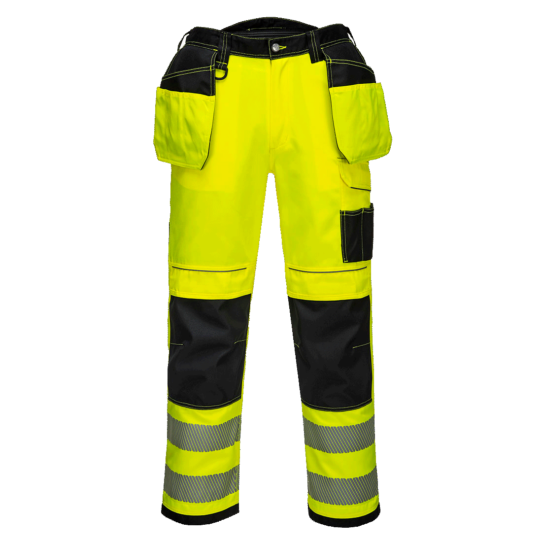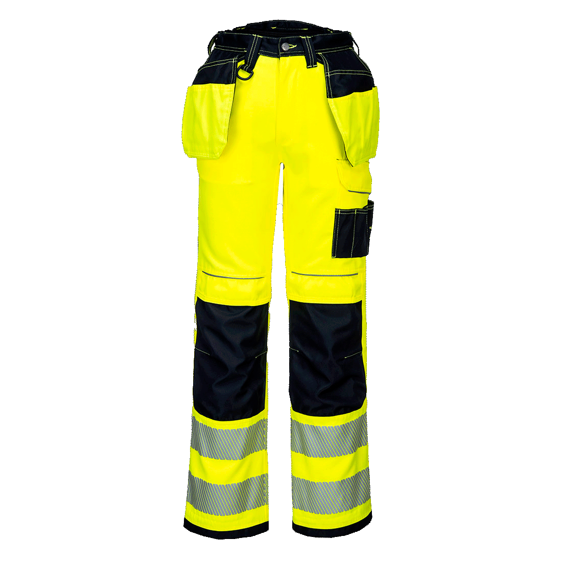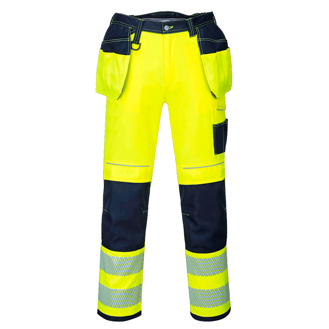 Ajatuksella suunnitellut HiVis- työhousut, riipputaskut, ylhäältä avoimet polvityynytaskut, kaksisuuntainen reisitasku, suljettava puhelin-,avain-,työkalutasku.