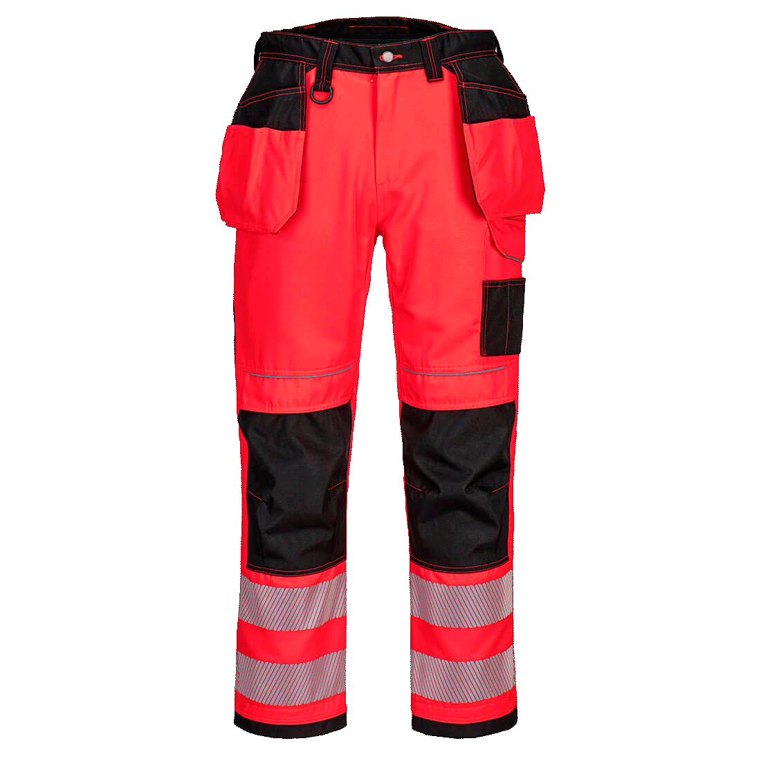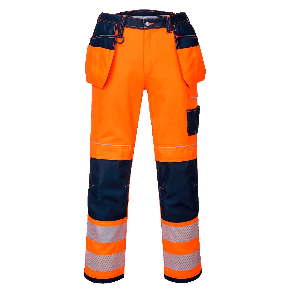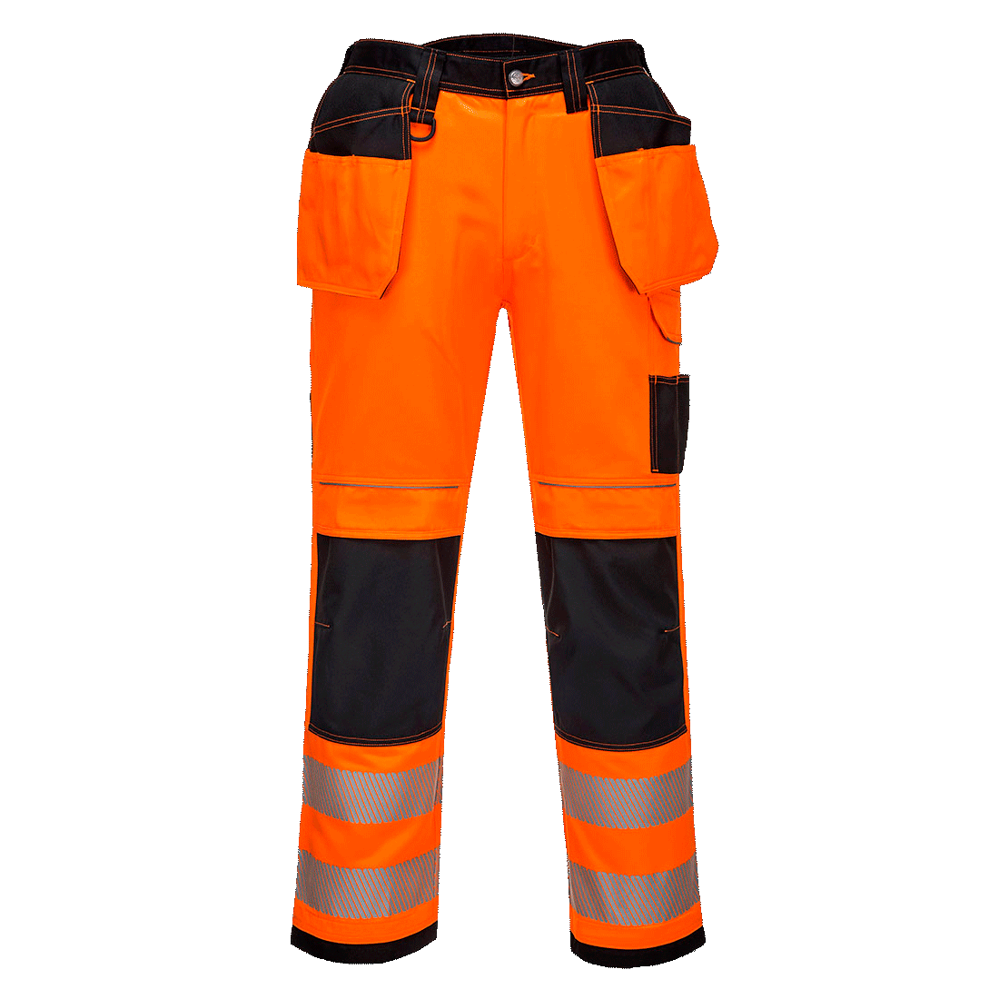 Ajatuksella suunnitellut HiVis- työhousut, riipputaskut, ylhäältä avoimet polvityynytaskut, kaksisuuntainen reisitasku, suljettava puhelin-,avain-,työkalutasku.
